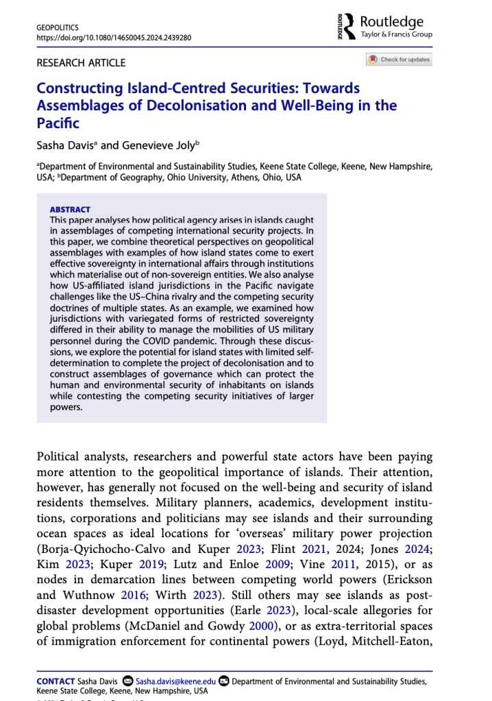 The article “Constructing Island-Centred Securities: Towards Assemblages of Decolonisation and Well-Being in the Pacific” in Geopolitics (2025)